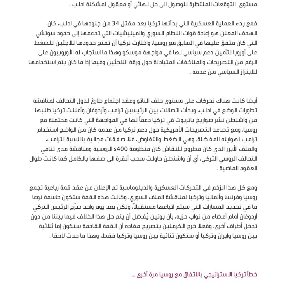 ومع كل هذا الزخم في التحركات العسكرية والدبلوماسية تم الإعلان عن عقد قمة رباعية تجمع روسيا وفرنسا وألمانيا وتركيا لمناقشة الملف السوري، وكانت هذه القمة ستكون حاسمة نوعا ما في تحديد المسارات التي سيتم اتباعها مستقبلاً، ولكن بعد يوم واحد صرّح الرئيس التركي أردوغان أمام أعضاء من نواب حزبه، بأن بوتين يُفضل أن يتم حل هذا الخلاف فيما بيننا من دون تدخل أطراف أخرى، وفعلا خرج الكرملين بتصريح مفاده أن القمة القادمة ستكون إما ثلاثية بين روسيا وايران وتركيا أو ستكون ثنائية بين روسيا وتركيا فقط، وهذا ما حدث لاحقا . خطأ تركيا الاستراتيجي بالاتفاق مع روسيا مرة أخرى … ولكن في ظل كل هذه المعطيات السابقة هل أخطأت تركيا بالاتفاق مع روسيا وتوقيع الوثيقة التكميلية و وقف إطلاق النار، وهل كان أمامها خيارات أخرى يمكن تطبيقها في قضية إدلب ؟؟ الإجابة ببساطة هي نعم ،، كان هناك العديد من الخيارات الدبلوماسية والسياسية والعسكرية التي كان من الممكن اتخاذها ولكن تركيا فضلت الحفاظ على علاقاتها الاستراتيجية مع روسيا وعدم السماح لما يجري بإدلب بتدمير هذه العلاقة، وهو خيار قد يكون واقعي من قبل أنقرة ولكن هذا في حالة أن موسكو ستحترم الاتفاق الذي تم توقيعه إو أنها احترمت الاتفاقات السابقة في سوتشي والآستانه من الأساس . بالتالي فإن ما تم التوقيع عليه اليوم ليس سوى هدنة ليست بطويلة الأمد بالنسبة لروسيا والنظام وهي فرصة لتثبيت مواقعها التي سيطرت عليها في الهجوم الأخير وحشد الدعم العسكري والسياسي لبدء هجوم أخر على باقي المناطق في ادلب وقد يكون هذا الهجوم أقرب بكثير مما يتخيله الأتراك . ماهي الخيارات الأخرى التي كانت مطروحة أمام تركيا .. ولكن هل كان هذا الاتفاق هو الخيار الوحيد أمام أنقرة؟، باعتقادي لا، فقد كان هناك الكثير من الخيارات التي يمكن اللجوء اليها في مرحلة ما . الخيار الأول : كان استجرار الأوروبيين الى الدخول في الملف السوري والاصرار على عقد القمة الرباعية ومشاركة فرنسا وألمانيا وخاصة بعد بدء العملية العسكرية التركية ، وأعتقد بأن روسيا كانت ستقبل بهذا الخيار إذا ما أصرت تركيا عليه، والأوروبيون أيضا سيدخلون في هذه القضية بكامل ثقلهم لأنها تمثل تحدي كبير بالنسبة لهم وهو موجة لجوء جديدة قد تكون أسوأ من التي حدثت عام 2015 . وكان يمكن للأوروبيين وضع كامل ثقلهم السياسي والاقتصادي في الضغط على روسيا لوقف هجومها على ادلب وتبني آليات تضمن إقامة مناطق آمنة في شمال سوريا وتوضع هذه المناطق تحت حماية الناتو إذا لزم الأمر ، هذه هي وجهة النظر الأوروبية ما وراء الكواليس ولكن هذا الخيار لم يعجب الروس والأتراك على حد سواء فهم يفضلون أن يكونوا منفردين في العمل في هذه المنطقة رغم أن صداماتهم أكثير بكثير من النتائج الجيدة لعملهم المشترك . الخيار الثاني : يأتي بالاتجاه نحو الاستعانه بالولايات المتحدة في الضغط عل روسيا والتفاهم مع واشنطن حول الملفات الخلافية وأبرزها منظومة ال s400، و إعادة النظر في التحالف الاستراتيجي الذي تم مع موسكو في السنوات الأخيرةو وهذه الخيارات كانت ستسيل لعاب واشنطن لتوجيه ضربة دبلوماسية كبرى لروسيا بسحب حليف قوي في المنطقة كان في بداية تحالف استراتيجي كبير معها، وحتى وإن لم يحدث هذا فإن التلويح بورقة التفاهم مع واشنطن كانت ستجعل بوتين يعيد حساباته مرة أخرى في الهجوم على ادلب والتفاهم مع أنقرة حتى لا يخسر دولة تعتبر حليفة اقتصادية كبرى له قبل أن تكون حليفة استراتيجية . بالتالي فقد كان بالإمكان أمام تركيا أفضل بكثير مما كان، و إذا استطاعت الحفاظ على هذا الاتفاق الهزيل مع الروس فأن ذلك سيكون جيدا ، رغم اليقين بأن روسيا ستعود لتشن هجومها على ادلب من جديد بعد عدة أشهر وربما قبل ذلك وسنعود الى نفس الدوامة من جديد . ما هو الموقف الأوروبي والأمريكي … هل كانت تركيا وحيدة في مواجهة روسيا في شمال سوريا؟، وهل كان الموقف الأمريكي والأوروبي رافض لمساعدة أنقرة في تلك المواجهة. الجواب بالحد 